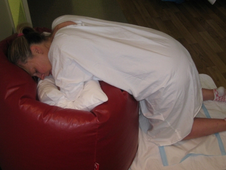 I stayed upright throughout the labour, kneeling over a bean bag, relaxing completely in the breaks, the whole time keeping my body semi-upright.