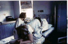 After the doctor broke her waters the contractions and pain intensified. The shower and balls were not working as well with this new level of pain. Also the urge to push was starting. The pain was becoming too much. Helen seemed selfconscious about making too much noise (the quiet breathing was now useless), so when the contraction hit, I started making more noise than her and told her to keep pace with me. I knew we had to get rid of the adrenalin. She was leaning on my shoulders and I could see that she was concentrating on the sound of us going 'AHHH,AHHH,AHHH' - and this was keeping the pain under control. I could actually see in her face when the pain was getting too much and I would tell her 'not to let the pain control her' and 'to be in charge of the pain'. This actually worked and I could see her getting back in control. It was fantastic to see the techniques work. It was only in the very last stages that Helen had to use the gas. She said later that the gas didn't relieve the pain it was just something else to do.