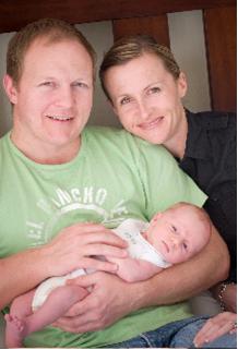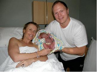It was now around 6am and Dr. Hartman arrived, he couldn't believe how well I was doing so he kicked back in the recliner chair and left me to focus. Suddenly I got the urge to push. So I started to huff and puff and push, but it didn't feel right. "Push like your going to the toilet" Denise said. So I tried again and still nothing. And then I heard Dr Hartman say, "How would Ju Ju tell you to push". "COFFEE PLUNGER" Dave yelled (the only part of the book he'd read was Sarah's introduction) and I remembered - I got it. But I was still feeling uncomfortable, I didn't feel like I was in the right position so Keith suggested I get on the bed and squat, at first I didn't want to because I thought it would be uncomfortable, but it wasn't, it was so much better the gravity was helping. Then came the burning sensation. I looked at Dave with a 'please help me' look in my eyes and he knew it was up to him to help push me now. To be honest I can't remember what he said, but whatever it was, it was perfect, in about 5 pushes we saw our baby's head. I was totally overcome. I knew I had a baby inside me, and I know it sounds strange but I didn't really realise it was until I saw it's head, I made everyone in the room look at the baby I had inside me (I'm sure they all thought I was totally mad). Dr. Hartman told me to keep pushing so we could see the rest of it. So with a massive push - George David Scammell arrived at 7;12am on the 18/08/08 weighing 3.2kg and 50 cm long with a 40 cm head (which didn't feel like a watermelon at all!!). My labour was 6hrs and 17 mins and it was unreal!