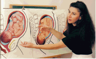 The woman begins her breathing and relaxation. She fixes her eyes on a spot on the far wall. As the contraction builds she slowly rises from the chair and begins to sway. Her partner talks to her, telling her to relax, to breathe, to focus on the cervix opening, to let the pain do it's work, but to let the tension go, to breath faster if necessary, to make the ahhh sound if this helps more, to keep swaying, HALF WAY! good, you are doing well, keep focusing, .................................................. 15 seconds to go, relax, breathe,.......5 seconds to go......now its gone.... great..... now sit down and rest until the next one.